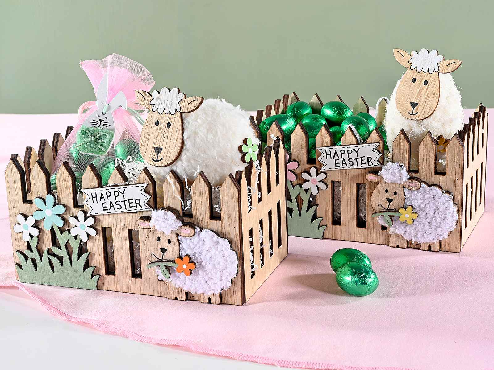 Cutii/coșuri garduri din lemn cu oaie moale de lână și scris de Paște Fericit