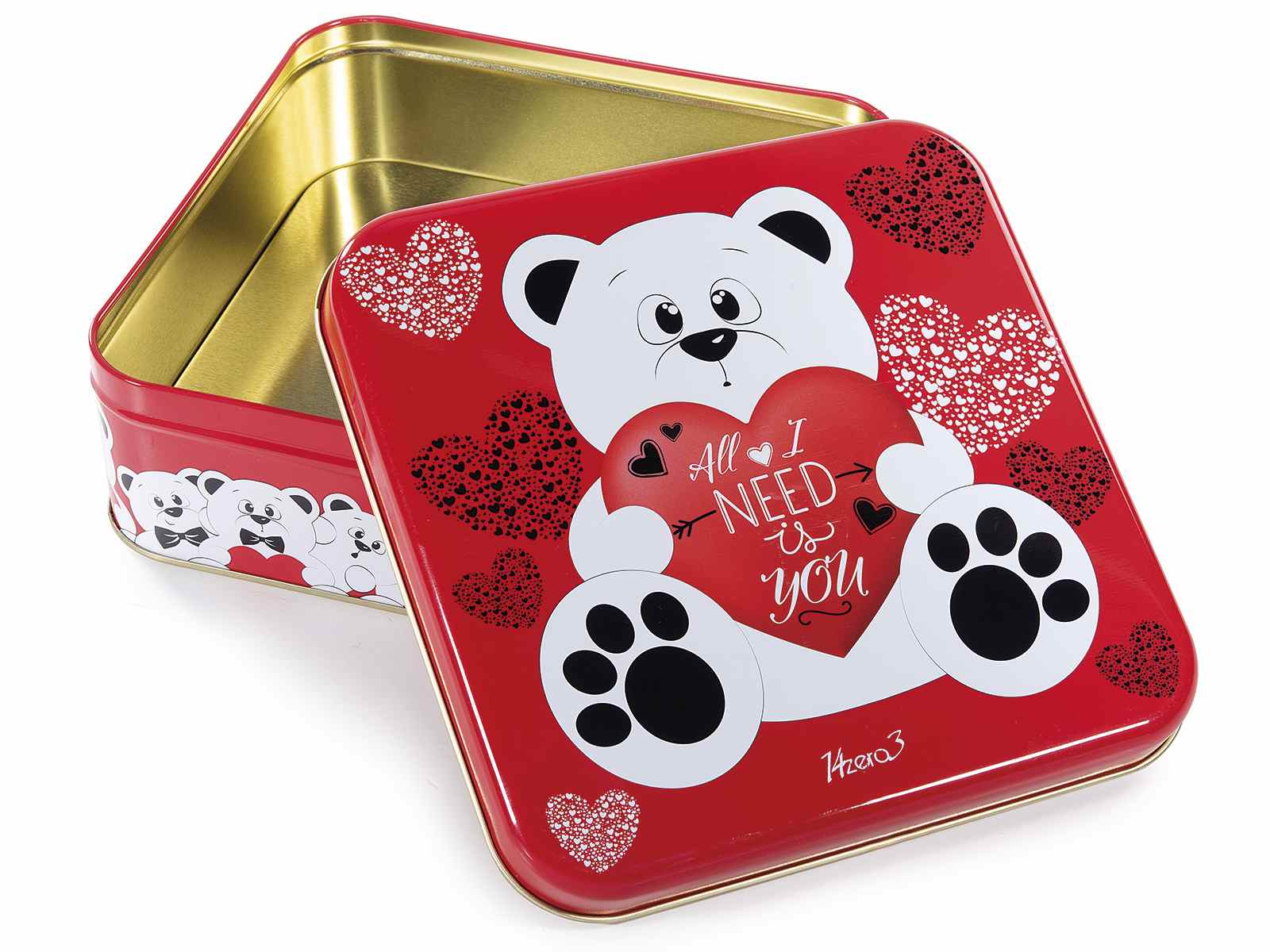 Cutii metalice pătrate roșii și albe cu imprimeuri de ursuleți de pluș și inimioare pentru Ziua Îndrăgostiților