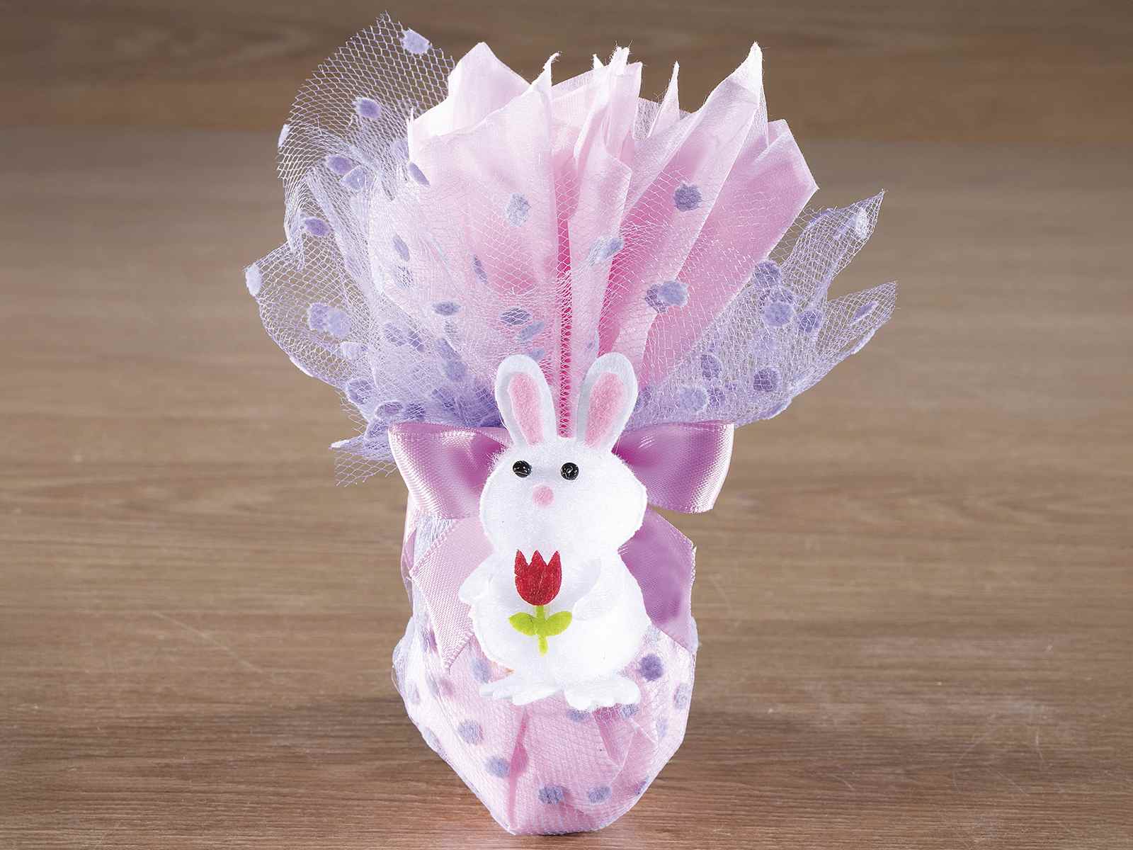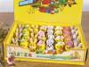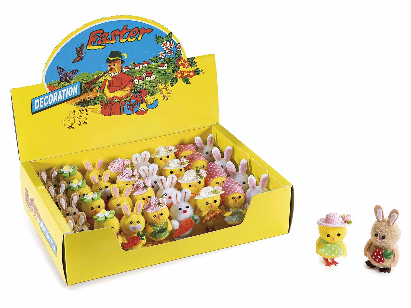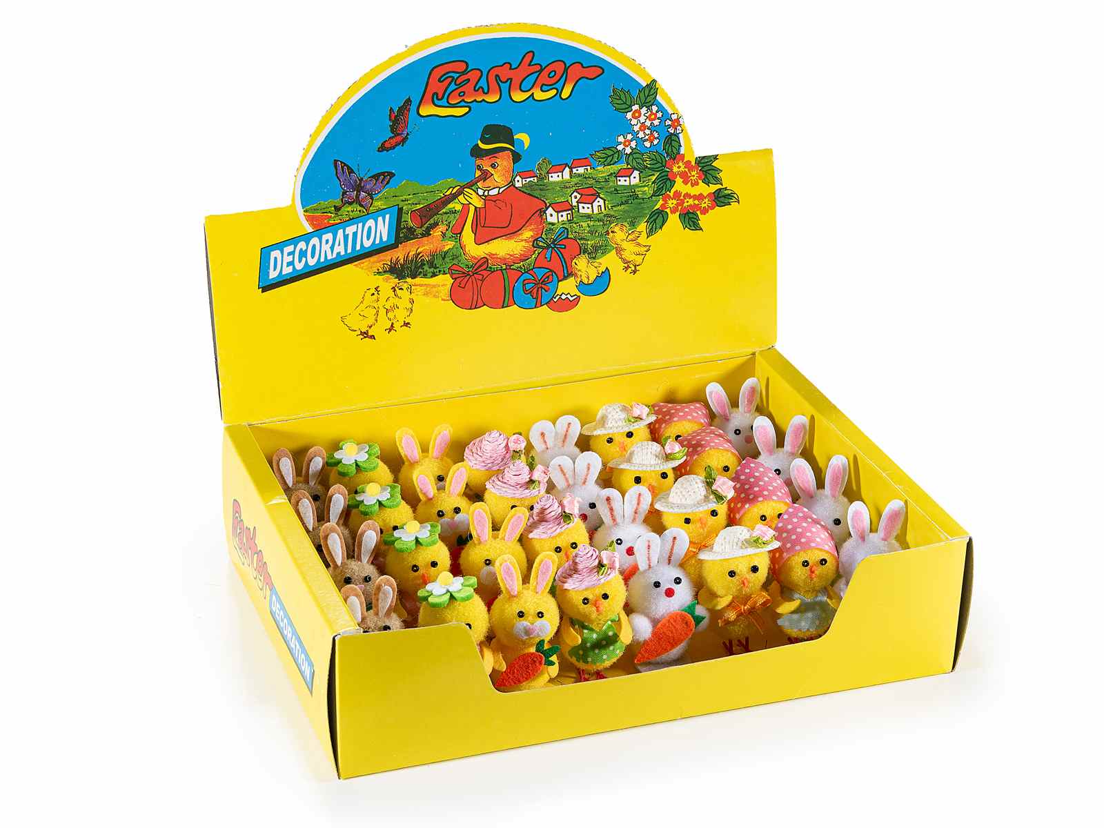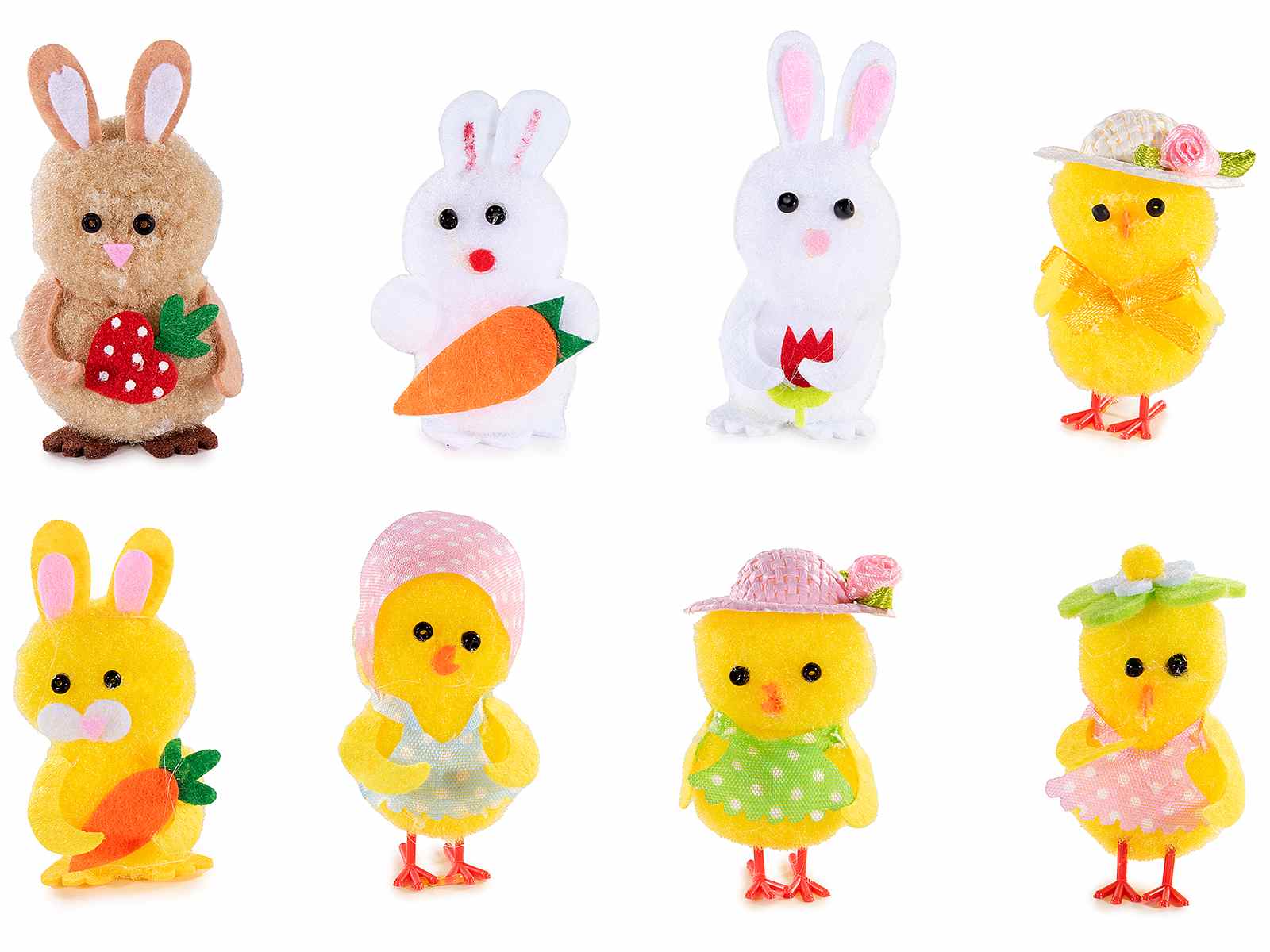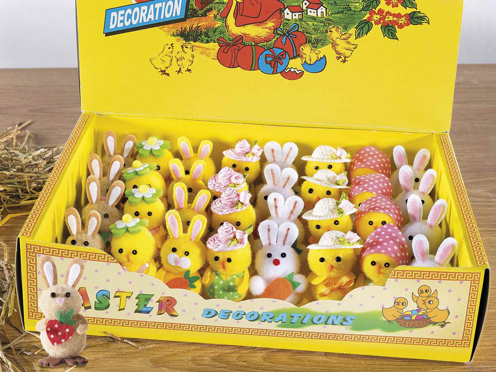 Pui și iepurași de Paște decorativi colorați în blană falsă într-o expoziție de 32 de piese