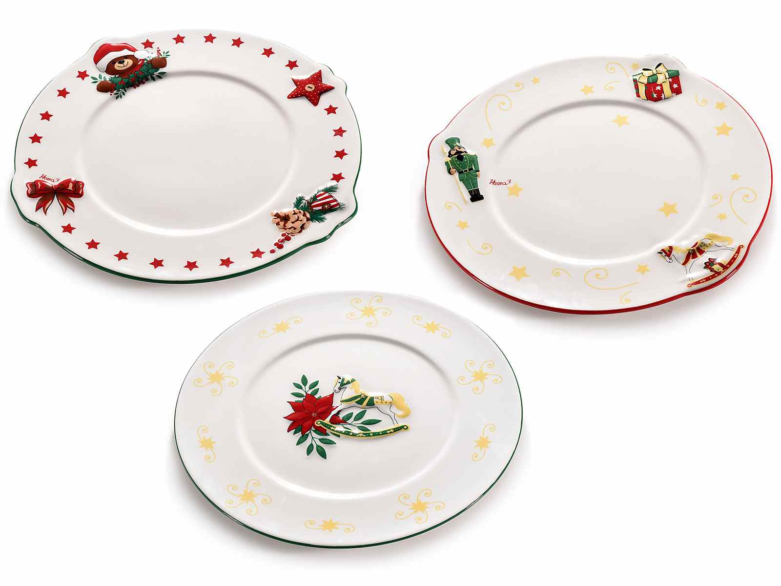Farfurii din ceramica de Craciun pentru mancare cu decoratiuni in relief, cu ursuleti, poinsettias si spargatori de nuci