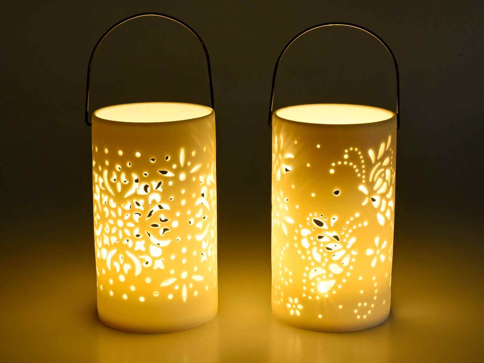 Felinare din porțelan opac cu decorațiuni luminoase sculptate și mânere metalice
