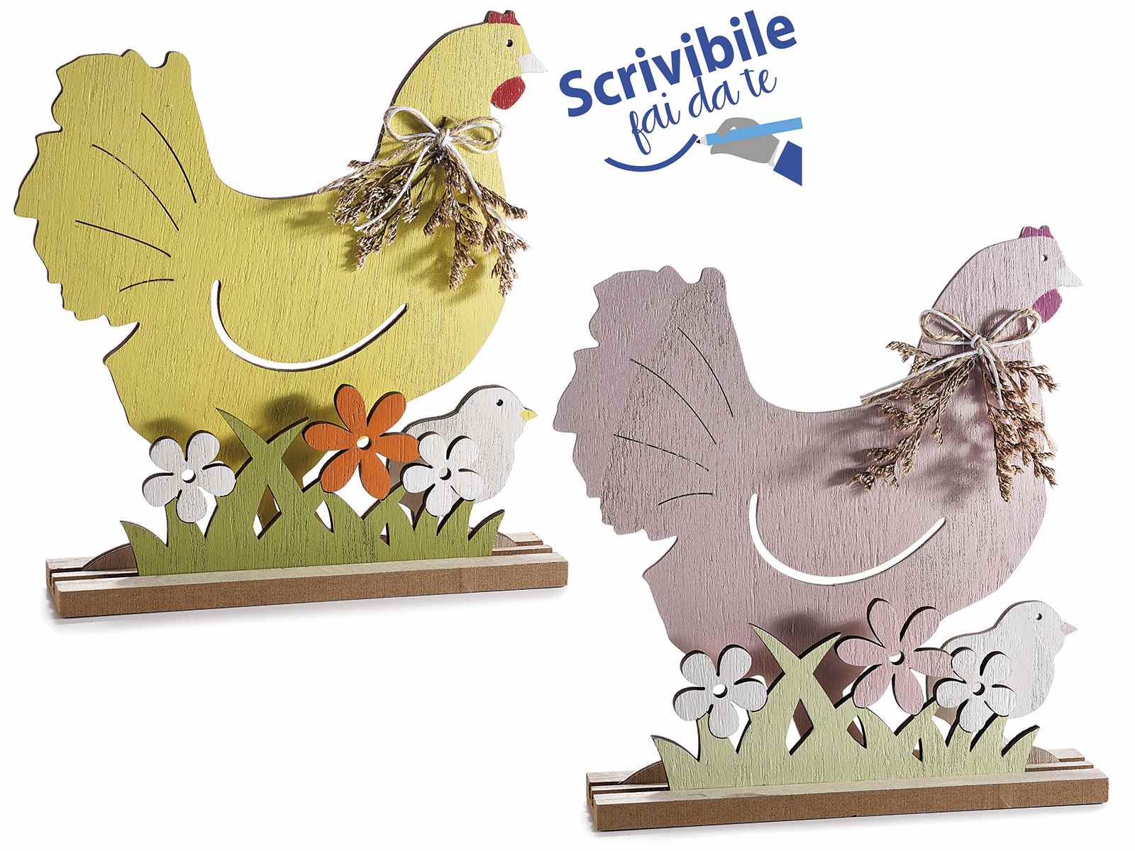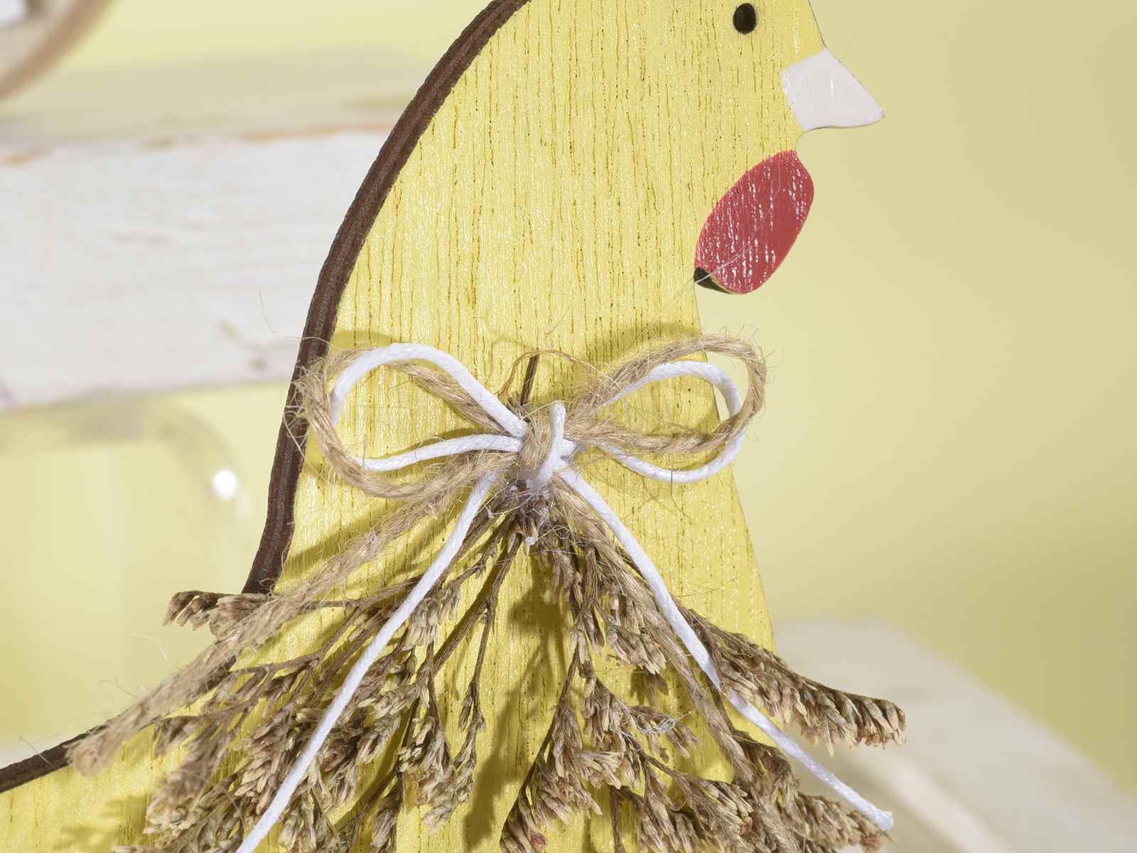 Găini din lemn de Paște pe pajiste de flori cu pasăre și arc