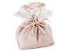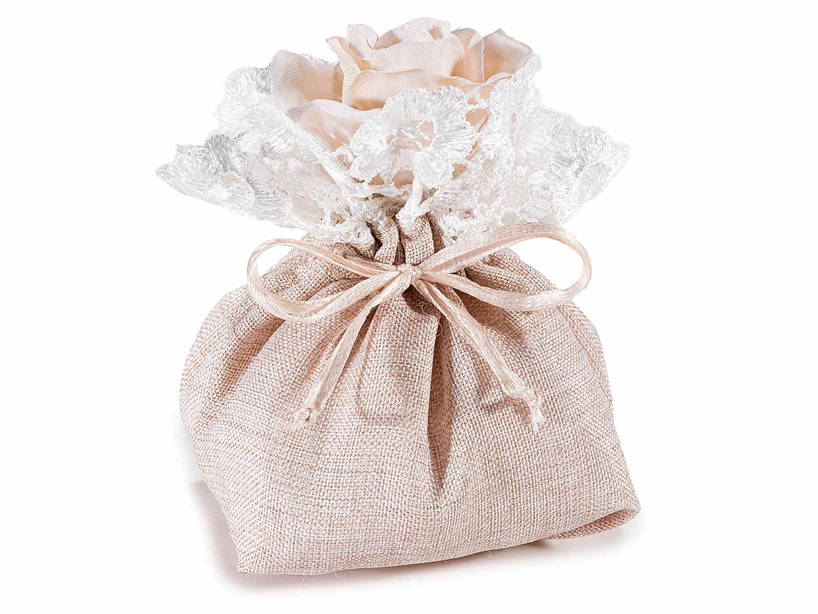 Pungi cadou din material ecru cu dantelă, trandafir și șnur de fixare