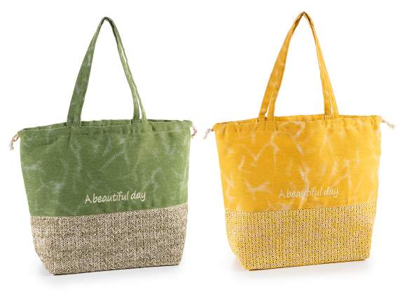 Genți de plajă din material brodat, cu bază cu efect de paie și inscripții
