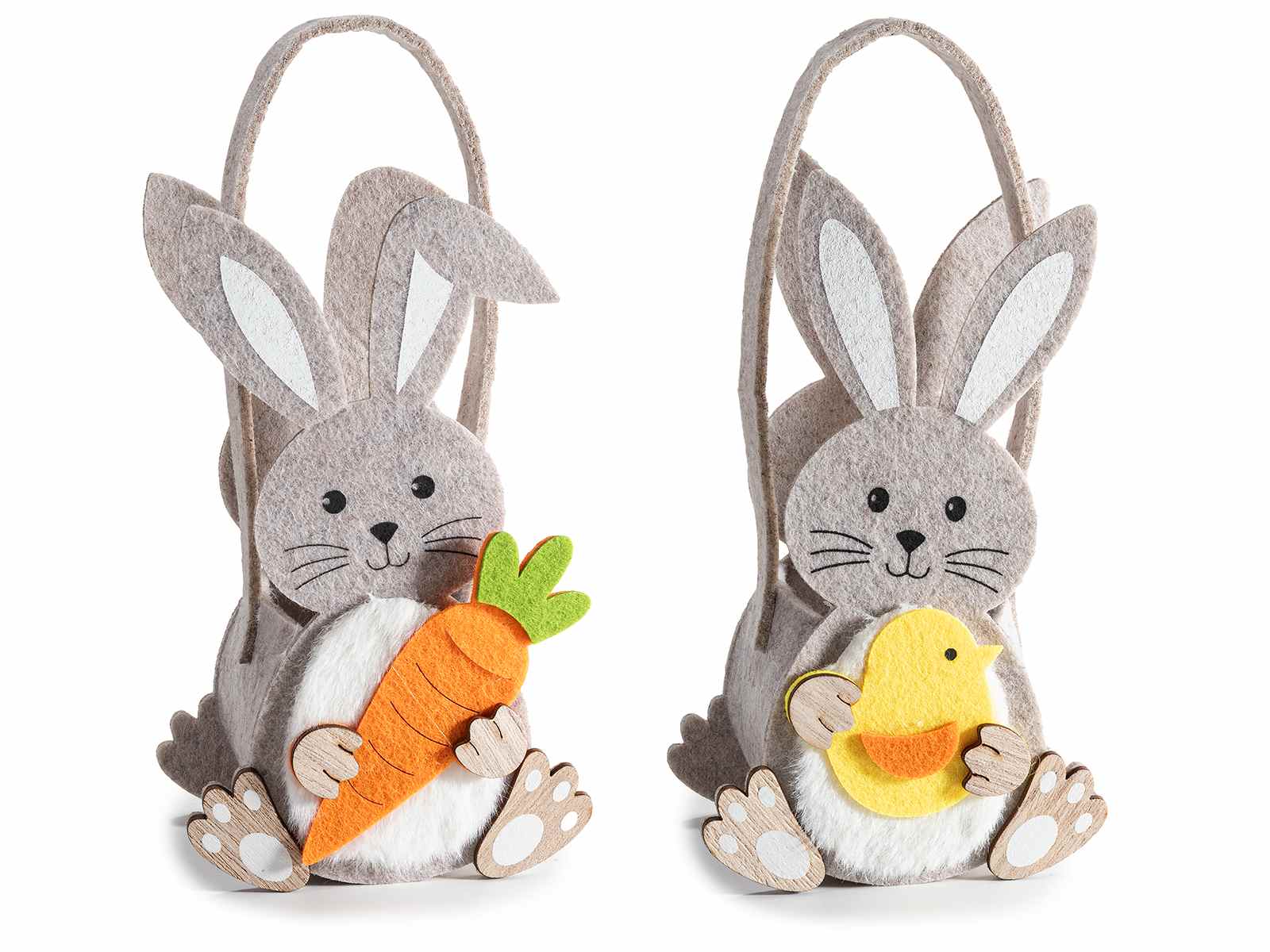 Pungi de Paște din pânză în formă de iepure cu decorațiuni în relief cu morcovi și pui și blană ecologică