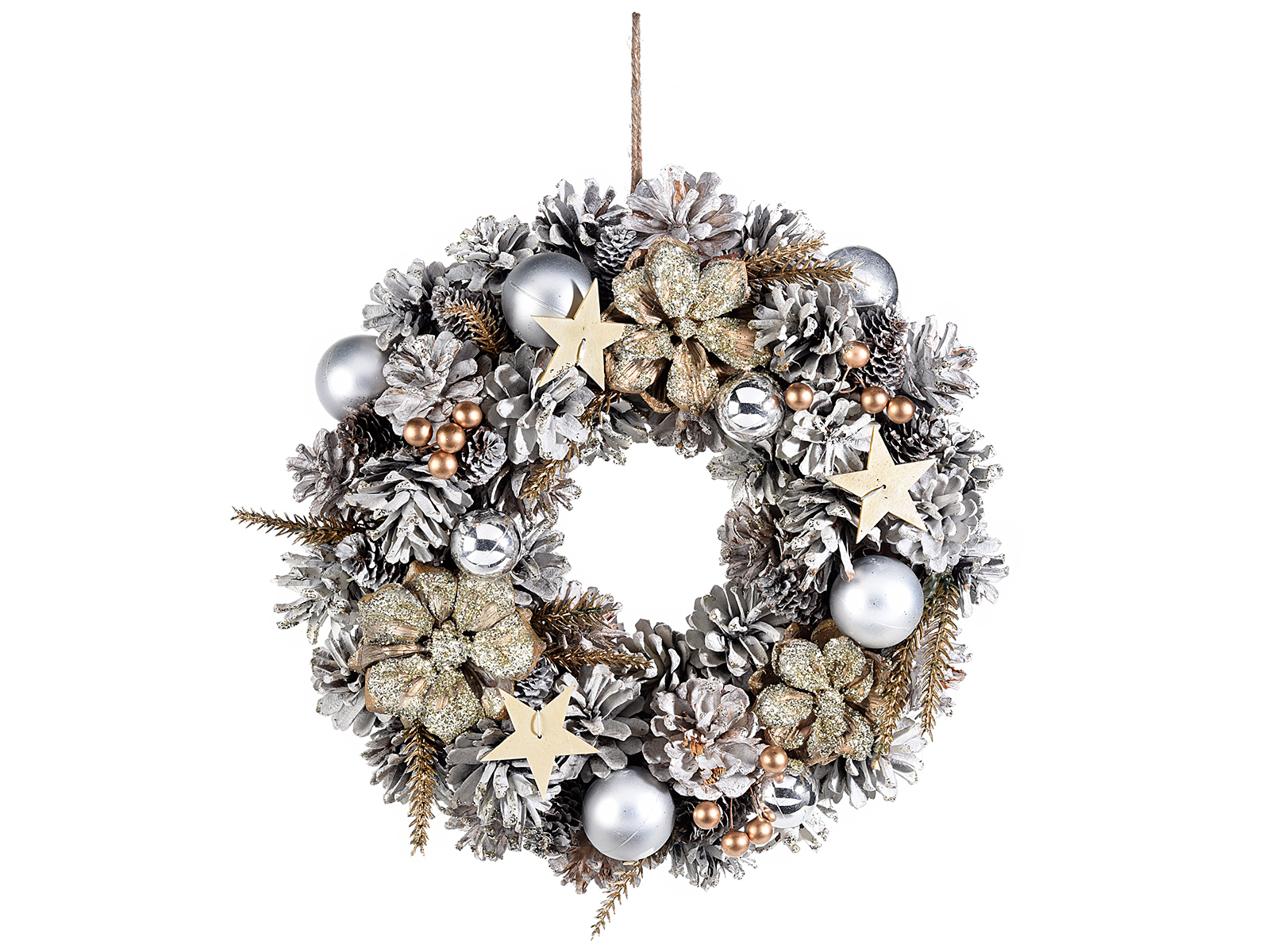 Ghirlandă cu conuri de pin strălucitoare, cu bile și flori d