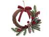 Coroana de Craciun din crengi împletite, decorata cu ace de pin acoperite de zapada, fructe de padure ro?ii, conuri de pin acoperite de zapada, globuri ro?ii ?i o funda. Include un ?nur de aga?at.