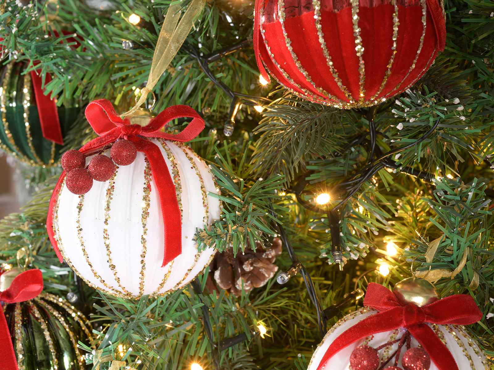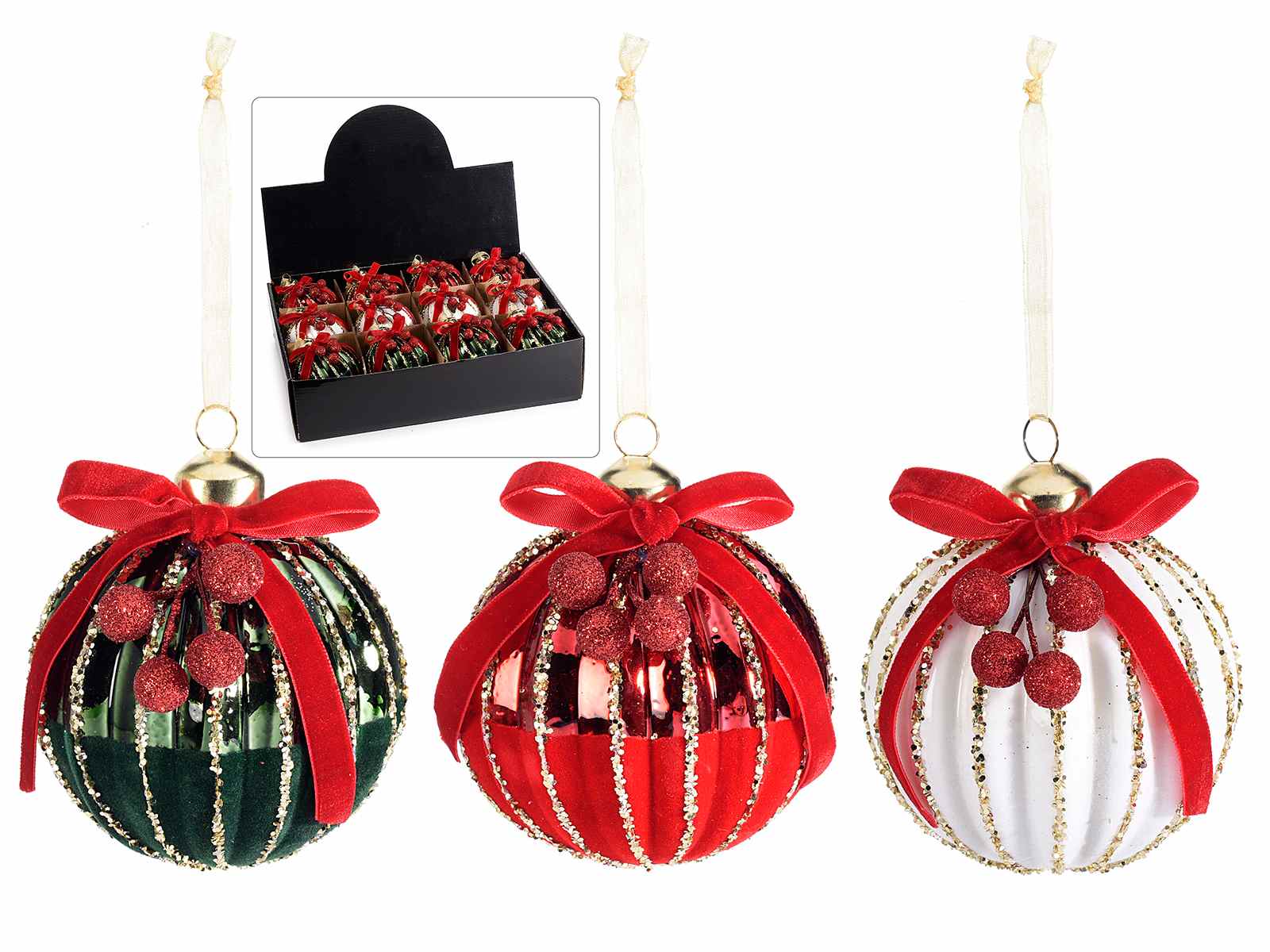 Globuri de Crăciun din sticlă cu decorațiuni cu fructe de pădure, sclipici și fundițe, de agățat într-un stand.