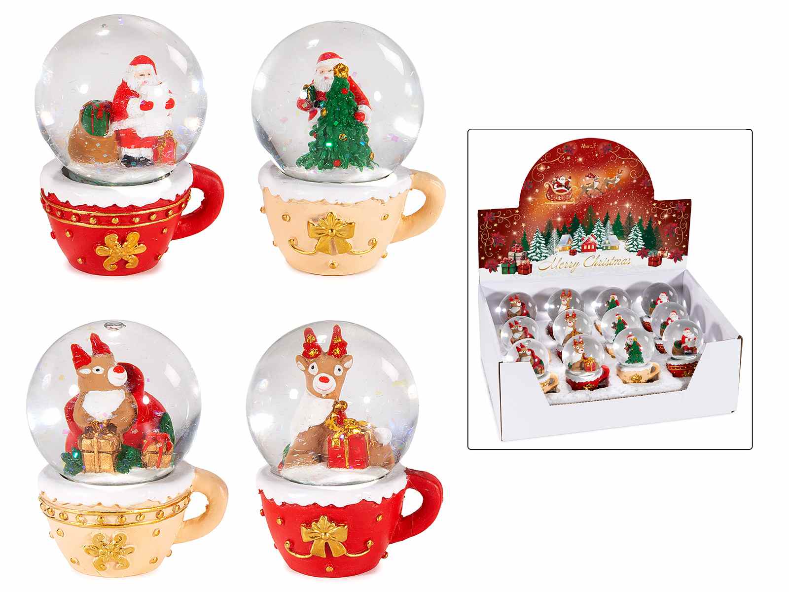 Glob de zăpadă de Crăciun pe o cupă cu un personaj de Crăciun și o bază din rășină, într-un display cu 12 piese.