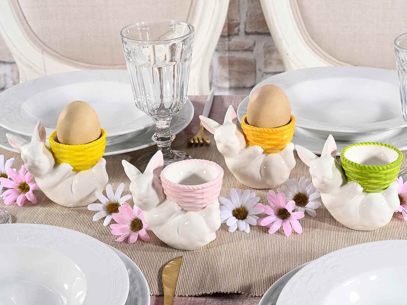 Suporturi pentru ouă de Paște din porțelan, cu coș colorat