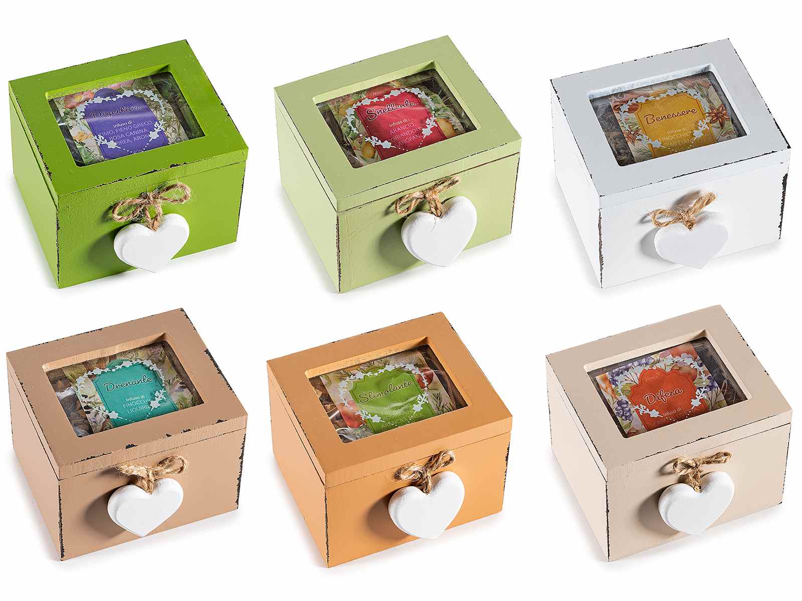 Cutie cu 6 ceaiuri din plante a câte 40g fiecare, într-o cutie de ceai/condimente din lemn colorat, cu sticlă transparentă și pandantiv alb în formă de inimă