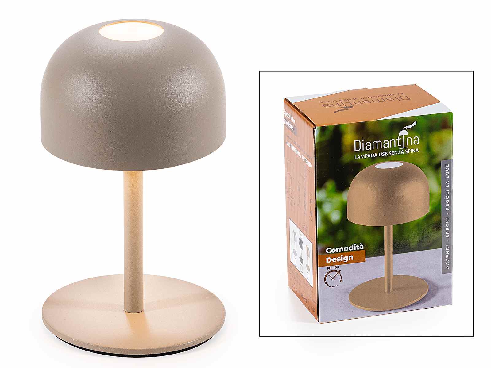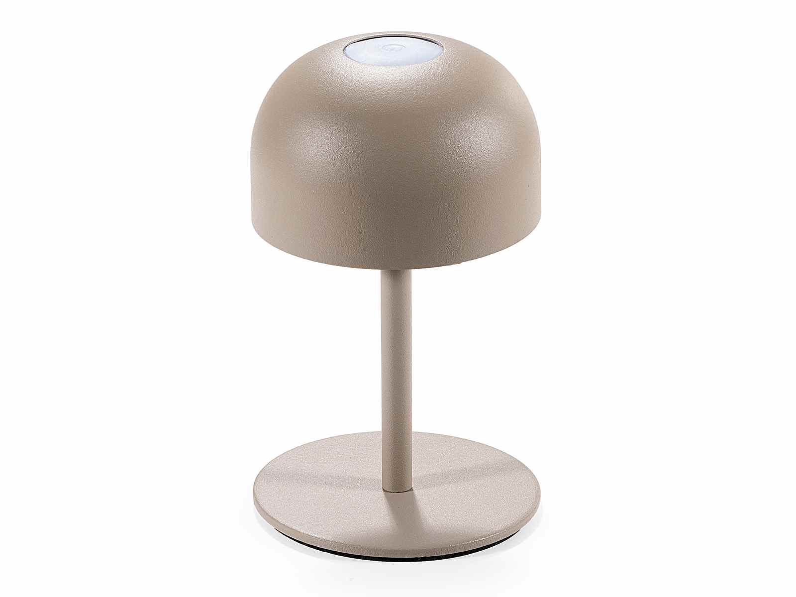Lampă mini din metal alb cu lumină LED, se aprinde printr-o atingere și se reîncarcă prin cablu USB, oferind o autonomie a bateriei de 9-10 ore. Are trei niveluri de intensitate reglabile printr-o atingere. Lumină albă caldă, ideală pentru utilizare