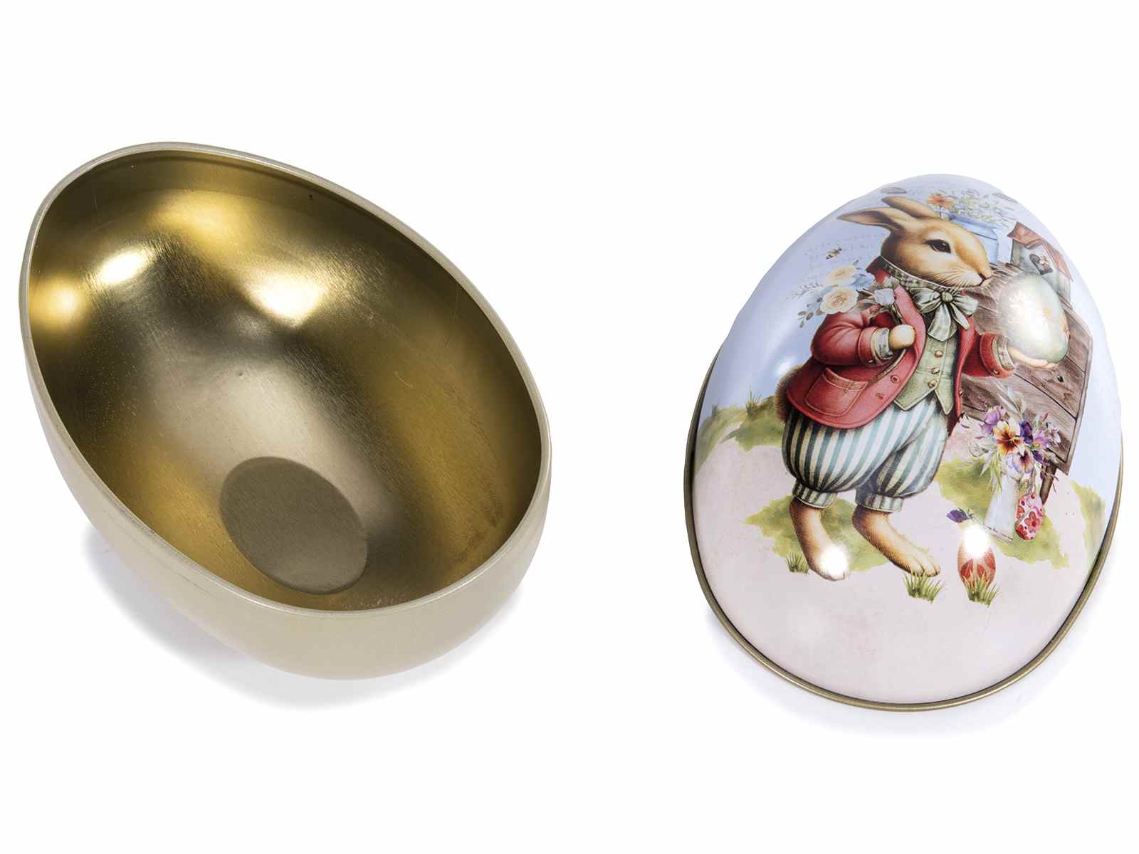 Ouă de Paște metalice, deschizabile, cu imprimeu de iepure, pentru a fi așezate pe masă