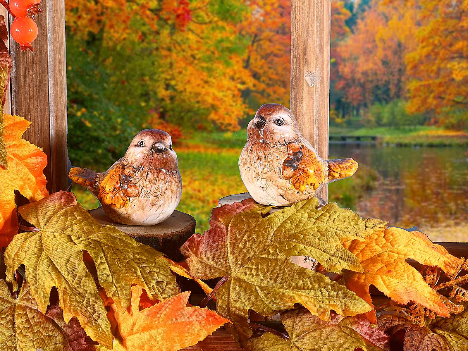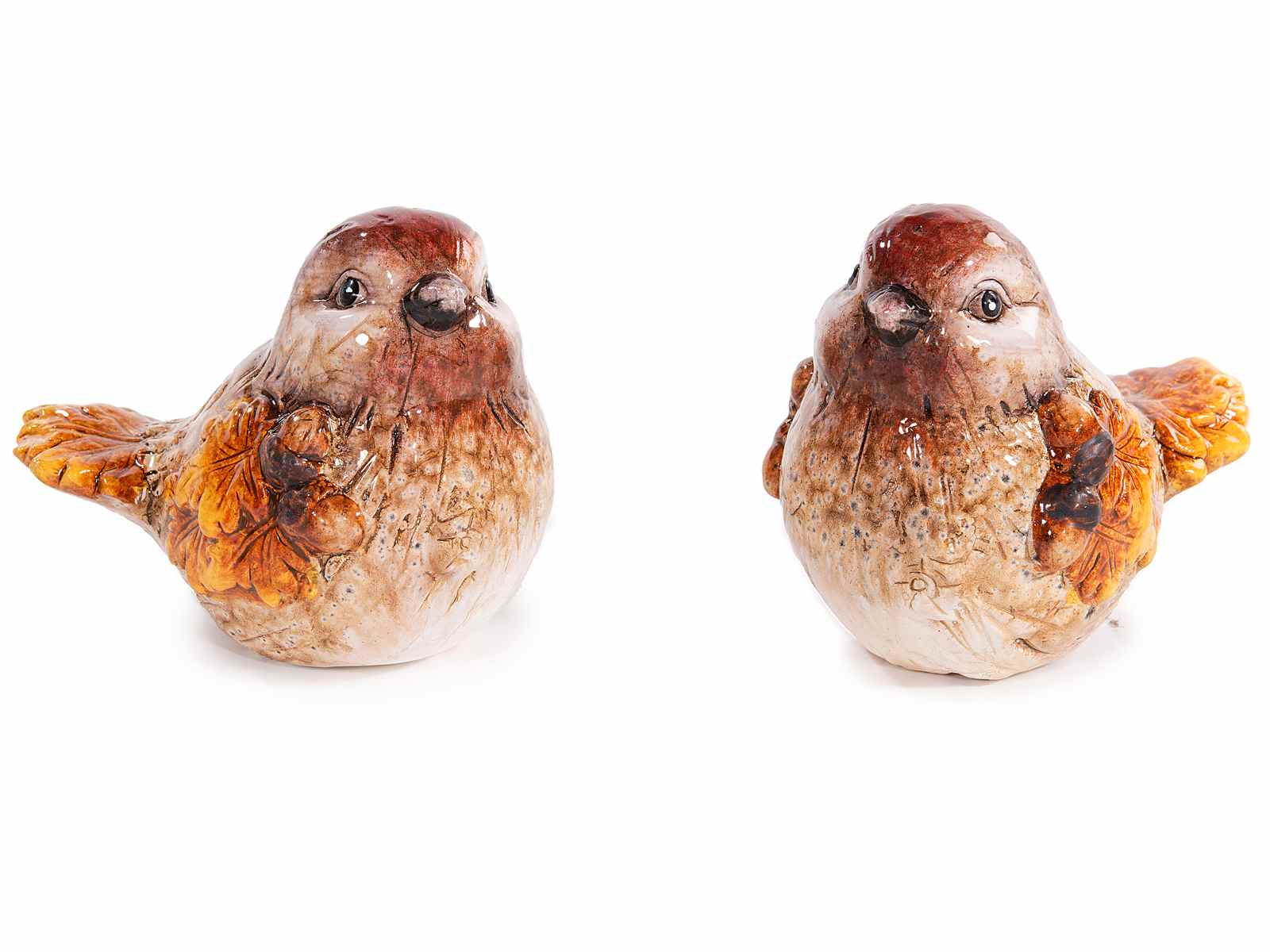 Păsări din teracotă lustruită cu decorațiuni din frunze de toamnă