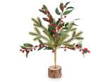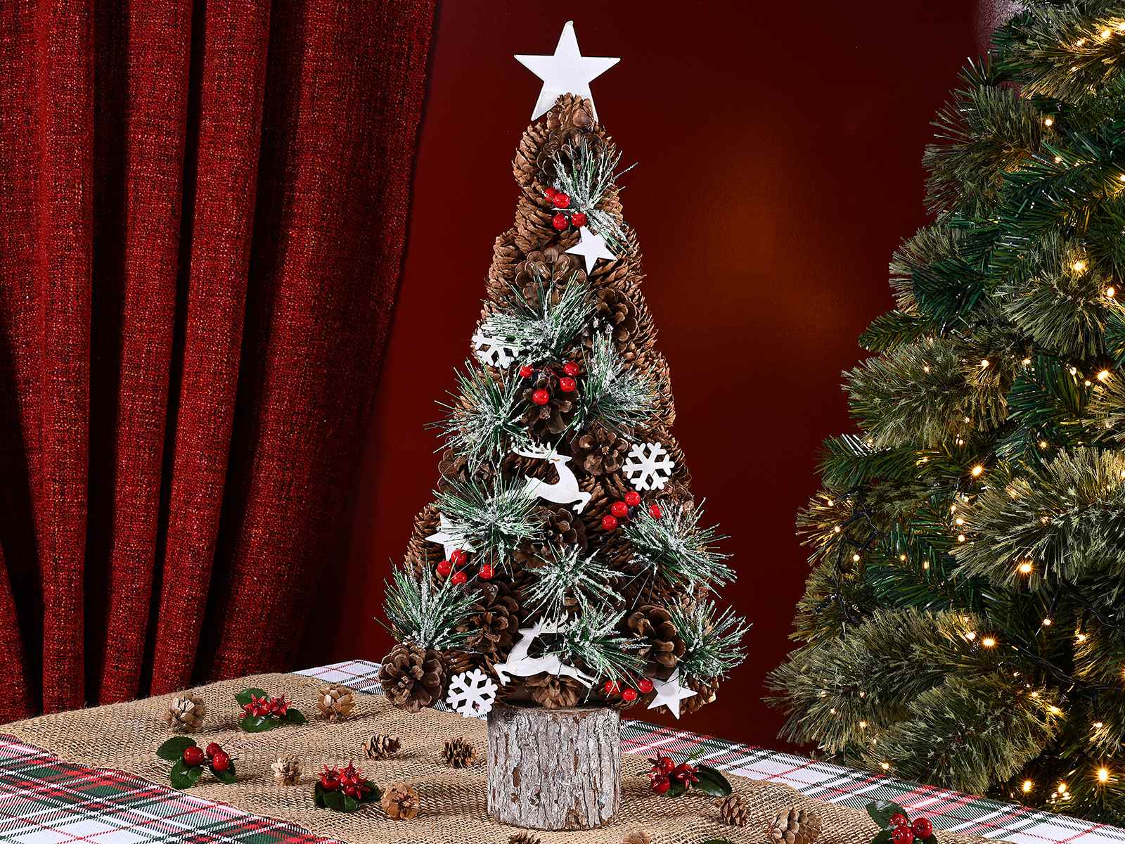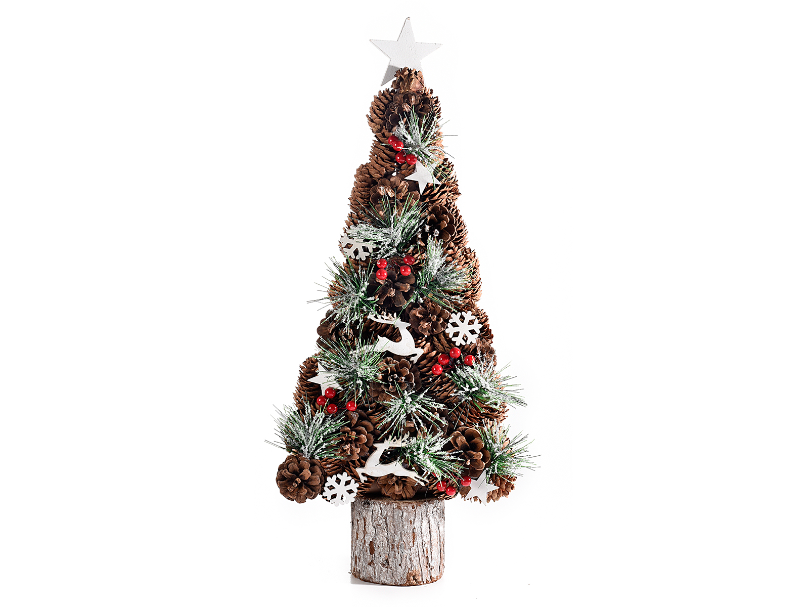 Brazi de Craciun decorativi cu baza de trunchi de lemn, structura de con de pin ?i ramuri de brad acoperite cu zapada, fructe de padure ro?ii, decora?iuni cu stele din lemn, reni ?i fulgi de nea cu vârf de stea