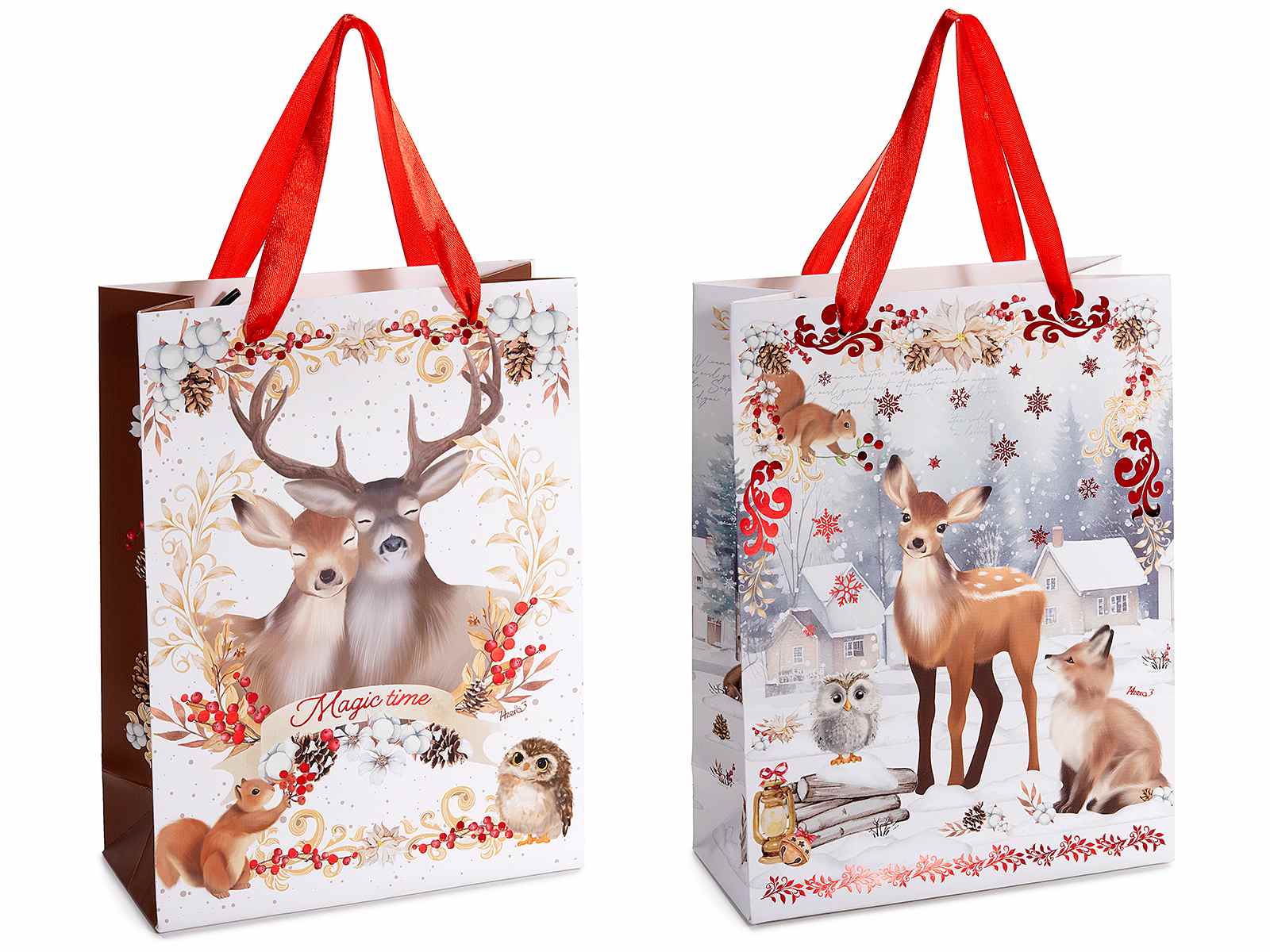 Pungi/plicuri/sacoșe de cumpărături de hârtie de Crăciun, de dimensiuni medii, cu mânere din satin, model cu animale de pădure