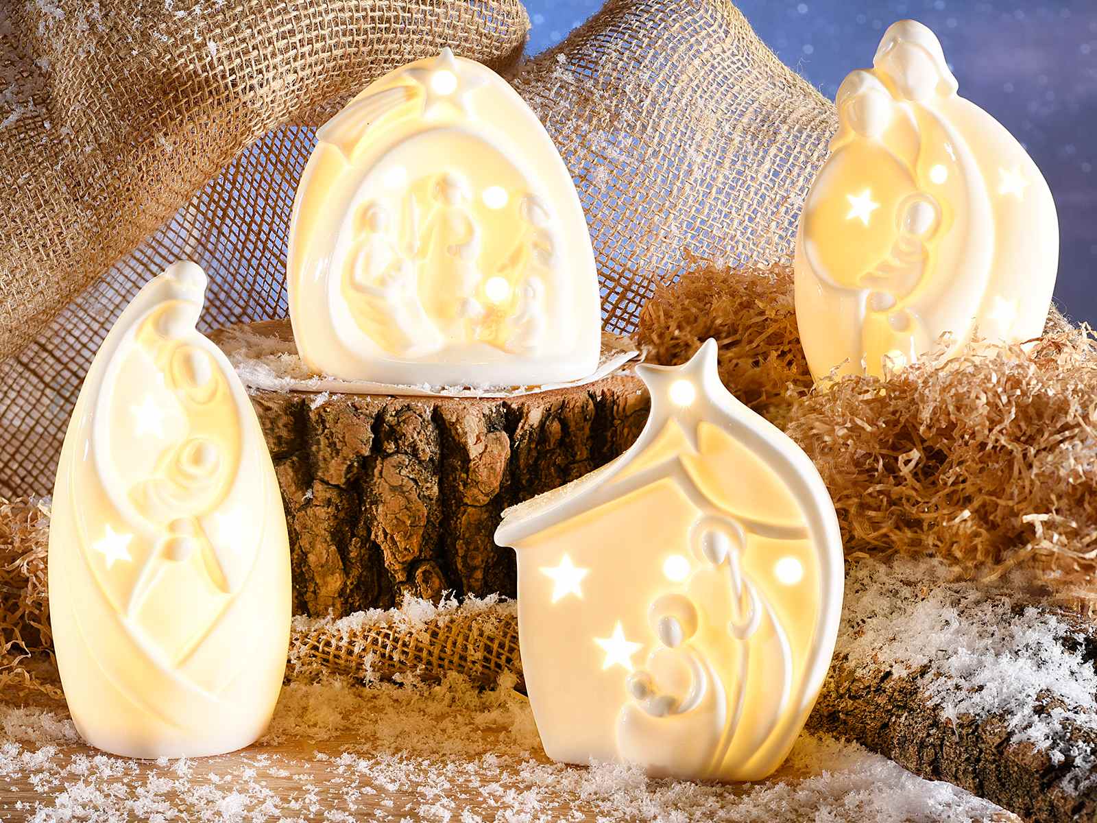 Scenă a Nașterii Domnului cu Sfânta Familie iluminată din porțelan alb cu lumină LED