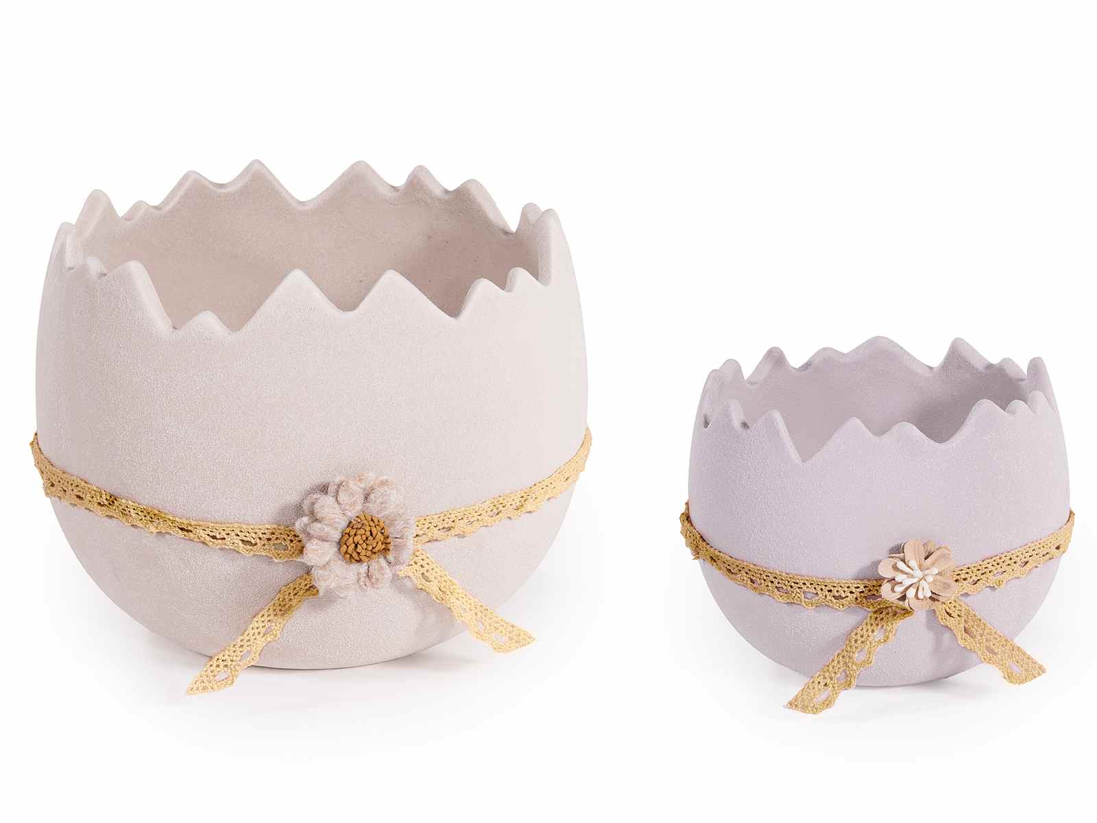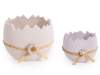 Recipiente în formă de ouă de Paște din ceramică brută cu panglică și floare decorativă în set de două