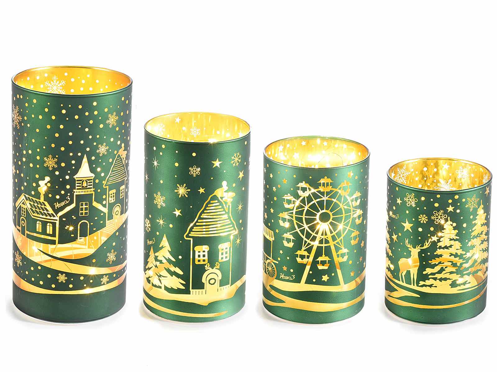 Set 4 lămpi cilindrice de Crăciun din sticlă decorate cu LED