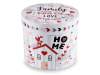 Căni de porțelan cu decorațiuni familiale și inscripții într-o cutie cadou cilindrică