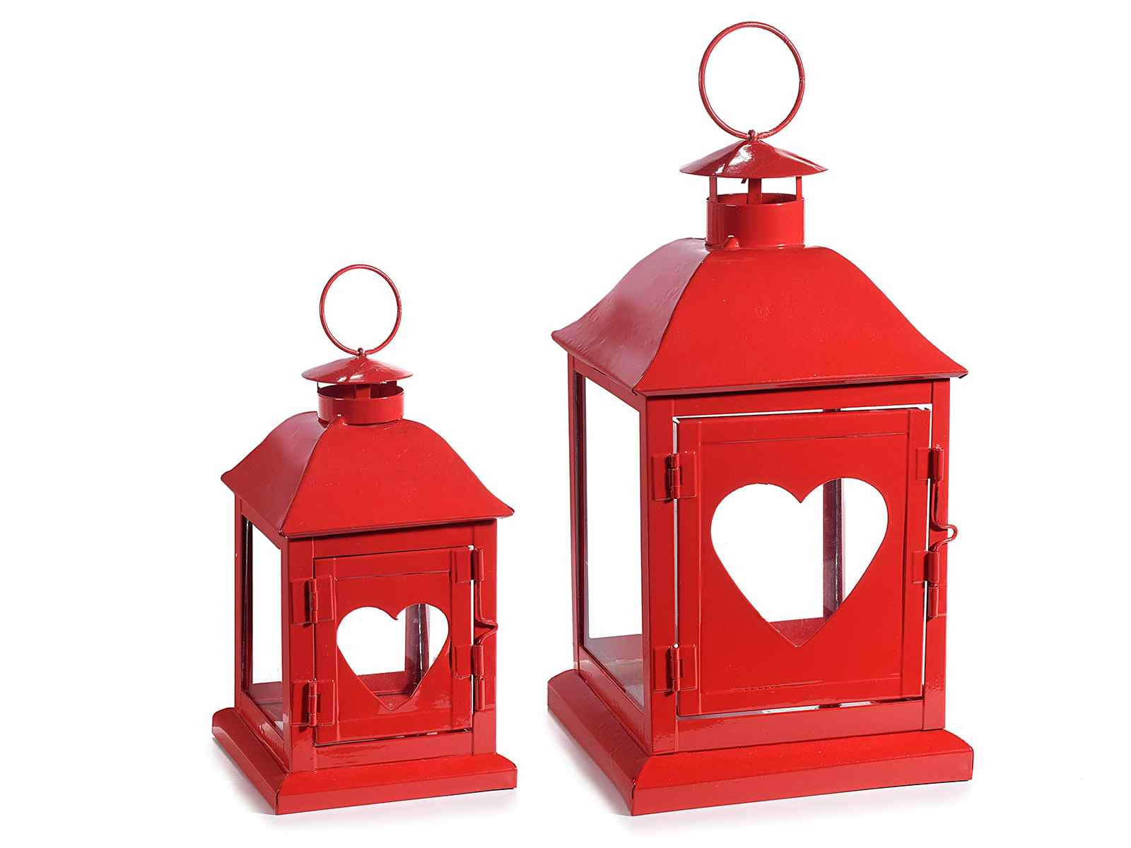 Felinare în formă de inimă din metal roșu, cu decupaje și găuri, inclusiv un cârlig de agățare, disponibile într-un set de două. Pentru Ziua Îndrăgostiților.