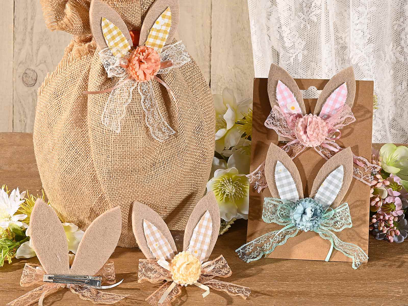 Cleme metalice decorative de Paște cu urechi de iepuraș din material textil, într-un set de două.