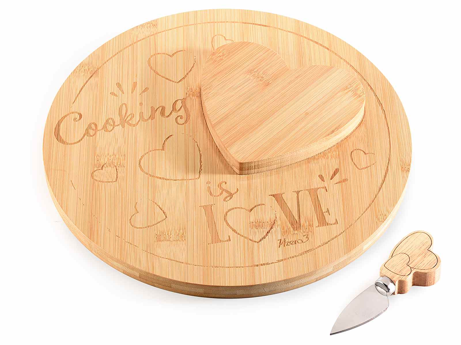 Tocător rotund și în formă de inimă din bambus, cu cuțit de brânză și decorațiuni cu textul Cooking Love, pentru o idee de cadou de Ziua Îndrăgostiților