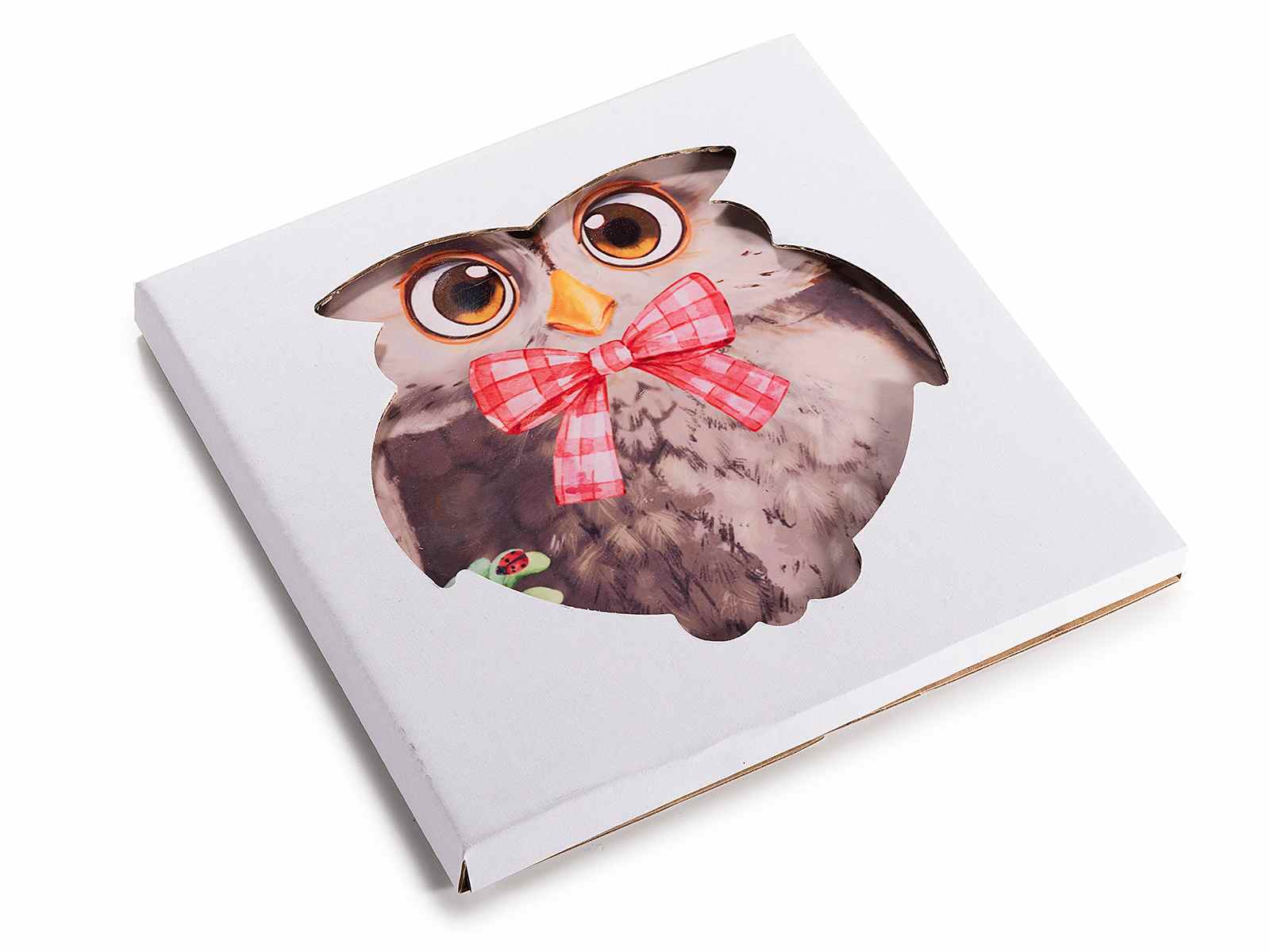 Suport de bucătărie autumnal în formă de bufniță, din ceramică lucioasă, cu bază din plută.