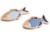 Tăvi din lemn cu margini în formă de pește și interior decorat