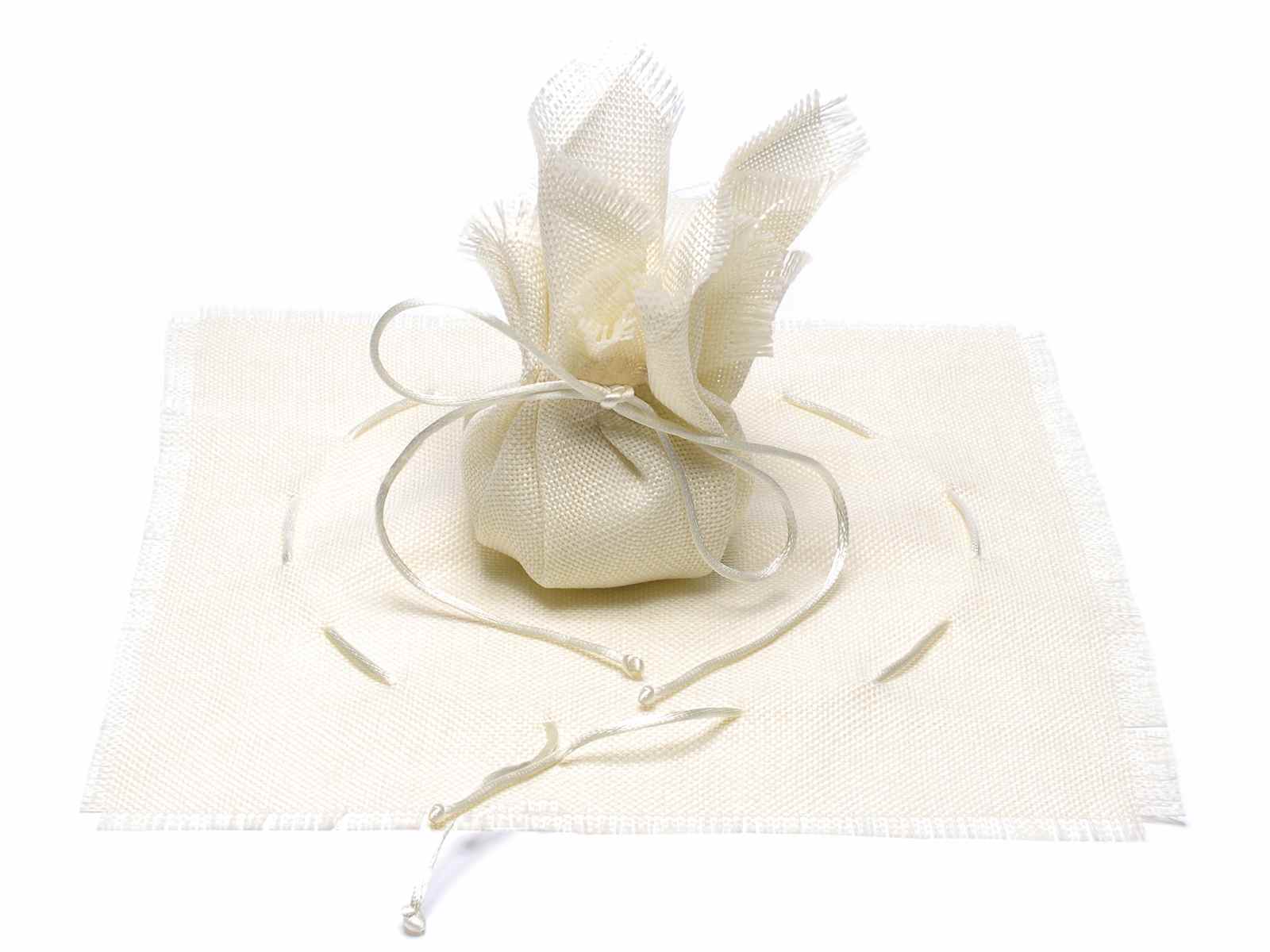 Tulle patrat din bumbac ecru pentru favoruri de nunta, cu margine uzata ?i ?nur pentru închidere u?oara. Ideal pentru ceremonii elegante, nunti, botezuri si ca favoruri clasice de nunta.