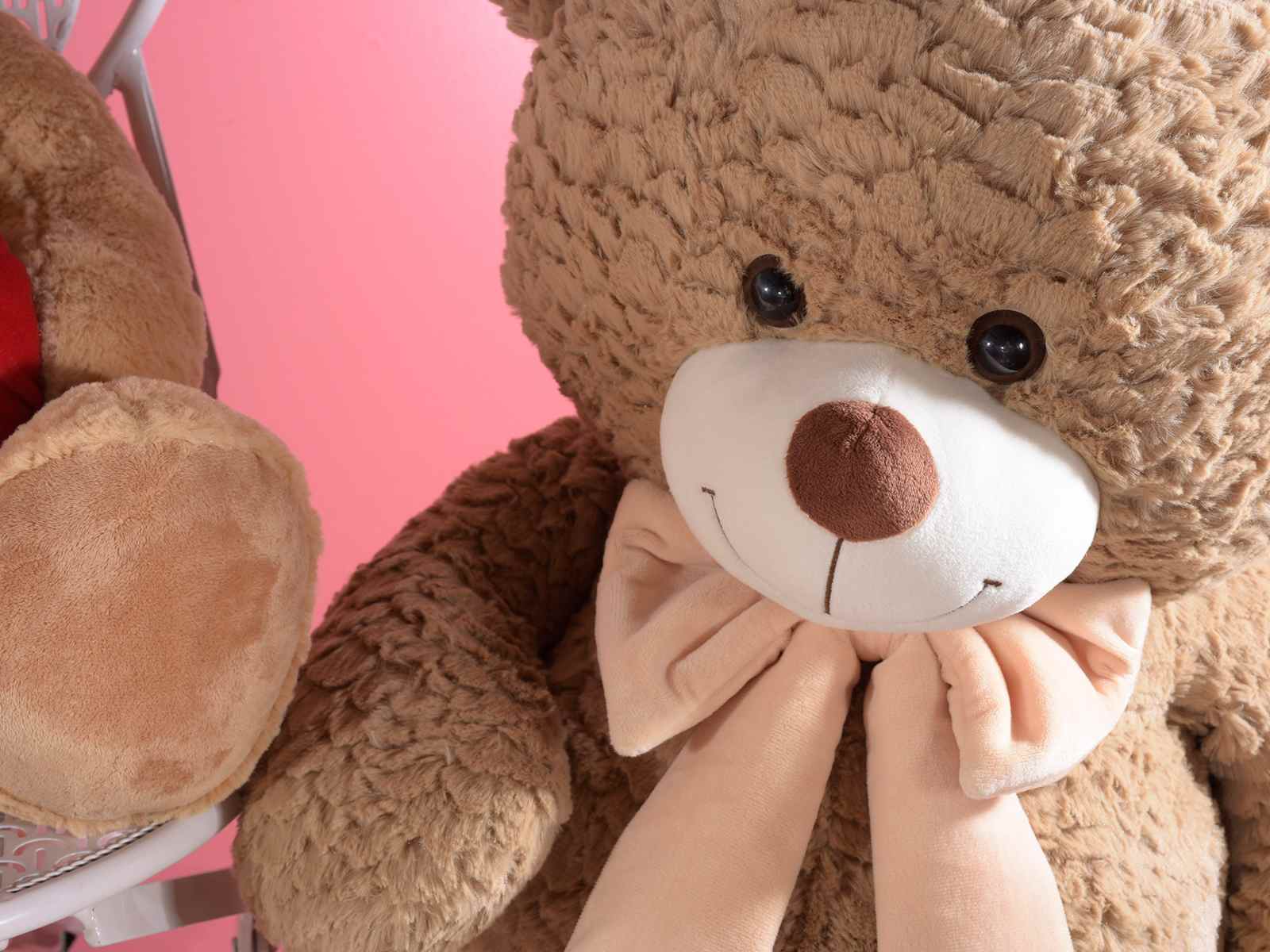 Ursuleți de pluș mari, maro, cu fundițe roz piersică, din material catifelat, ideali pentru decorațiuni de Ziua Îndrăgostiților