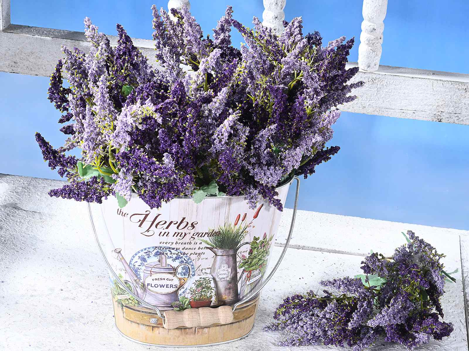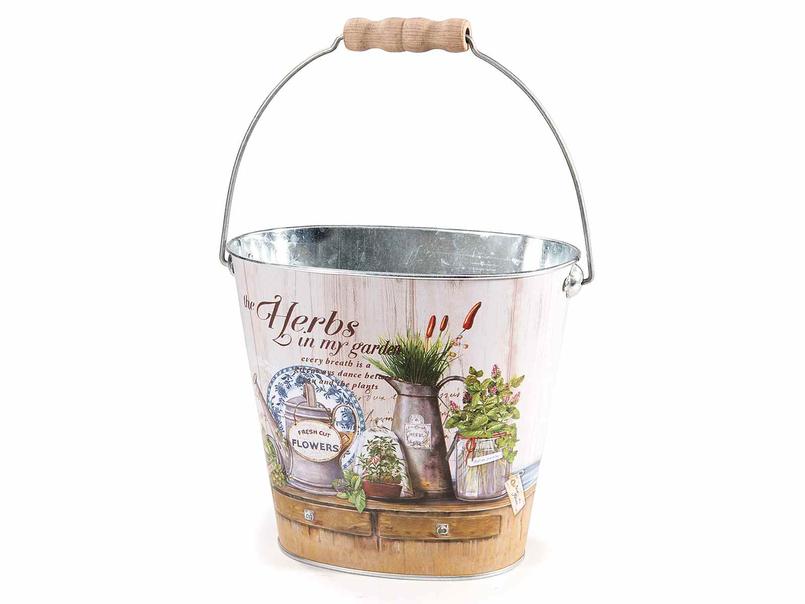 Vaze cu găleată din metal cu suport mâner din lemn cu decorațiuni de ierburi și condimente