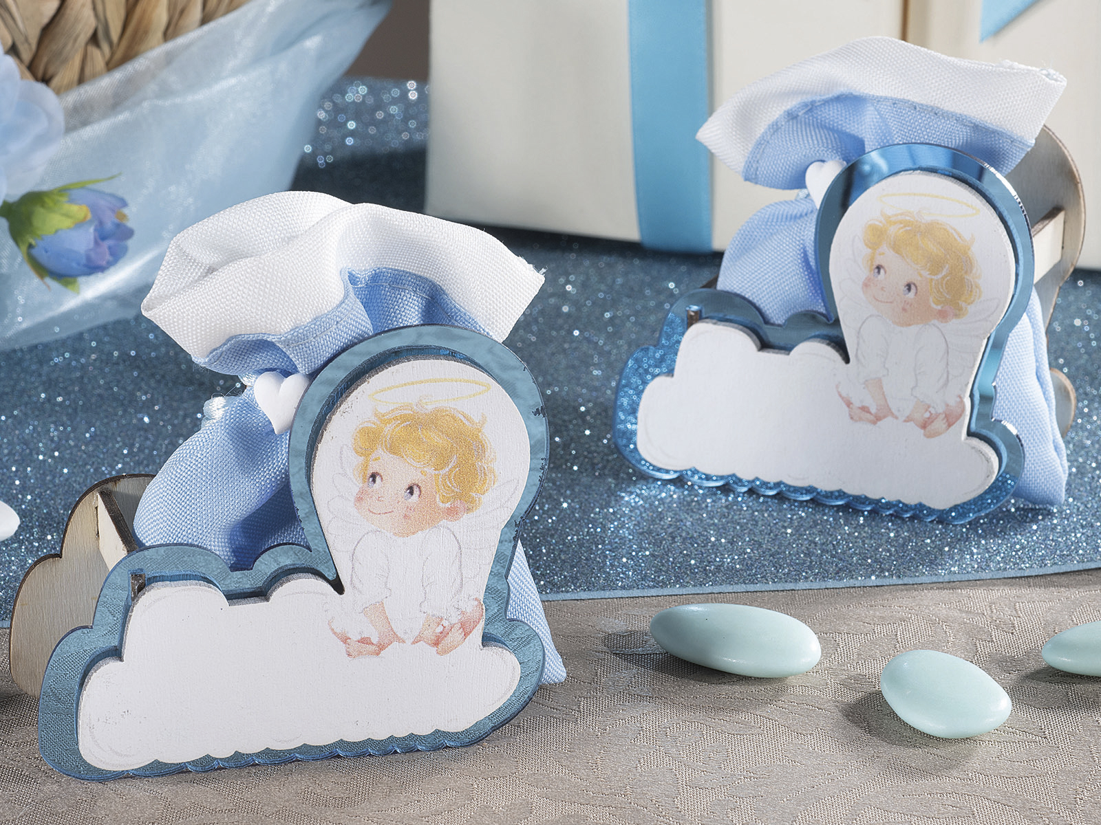 Favoruri pentru nastere bebelusi cu geanta din stofa pentru confetti cu aplicare din lemn de ingeras pe nor