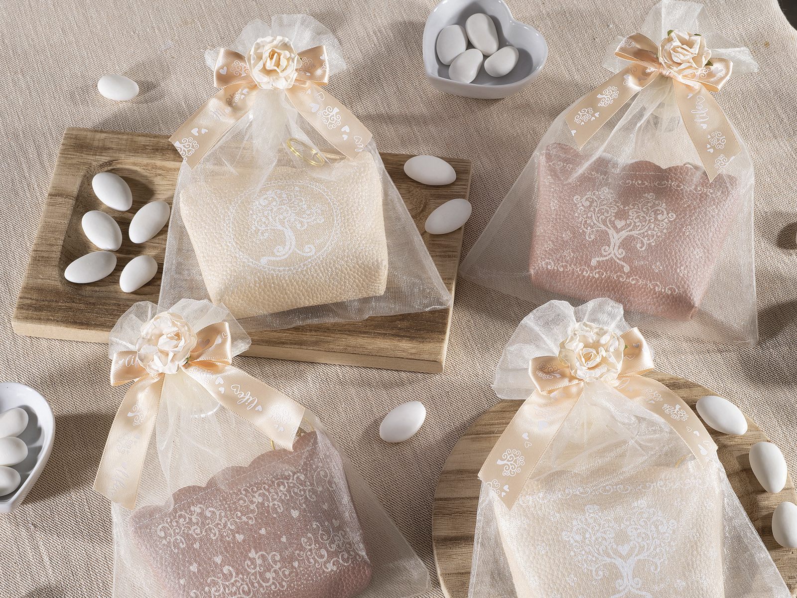 Poșete rafinate cu decorațiuni delicate ambalate în pungi de organza cu fundă perfecte pentru favoruri de nuntă șic și originale