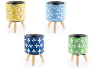 Vaze din beton colorate si decorate cu model majolica si trepied din lemn