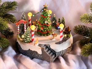 Sat de Craciun din rasina cu brad rotativ, lumini LED multicolore si muzica. Scenă detaliată cu case iluminate, personaje festive și brad de Crăciun.