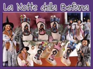 Ciorapi de Boboteaza suporturi pentru dulciuri din stofa cu decor Befana agatat si scrieri