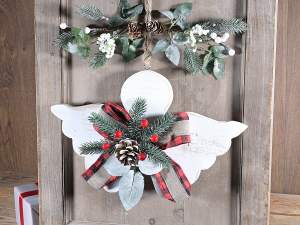 Înger de Crăciun din lemn alb cu fundă, crenguță, fructe de pădure și con de pin de agățat pe brad sau ca decor