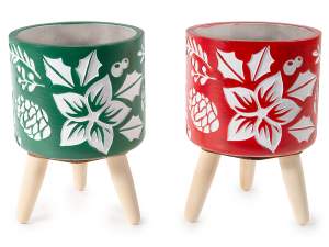 Vaze din ceramica de Craciun cu decor de ilfin, fundita rosie si clopot auriu in set de 2 bucati