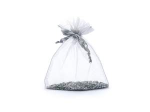 Geanta din organza argintie cu inchidere cu cordon din satin ideala pentru ambalarea micilor decoratiuni si bijuterii. Eleganța țesăturii semi-transparente face ca gențile să fie perfecte pentru ambalarea favorurilor de nuntă și de nuntă de argint.