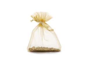 Geanta din organza aurie cu inchidere cu cordon din satin. O soluție rafinată și rapidă pentru împachetarea articolelor cadou, crearea favorurilor de nuntă și pachete de Crăciun.