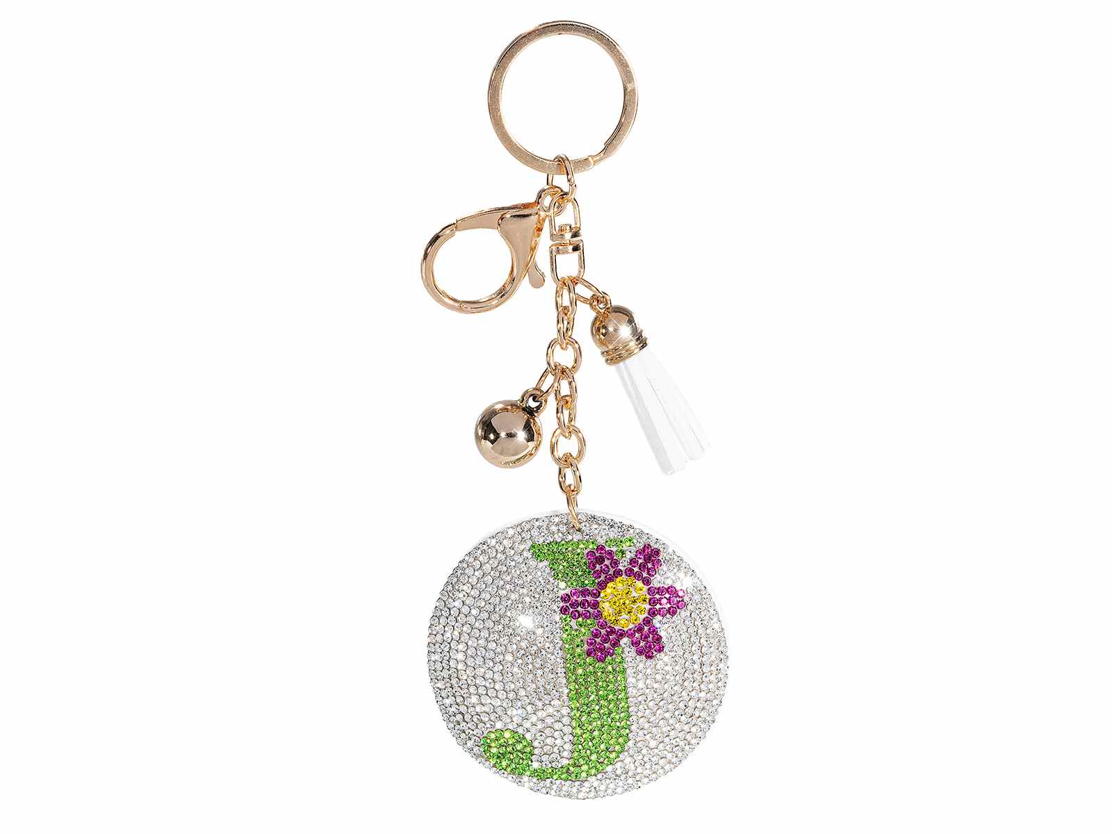 Charm/llavero letra J bronce con pedrería y borla