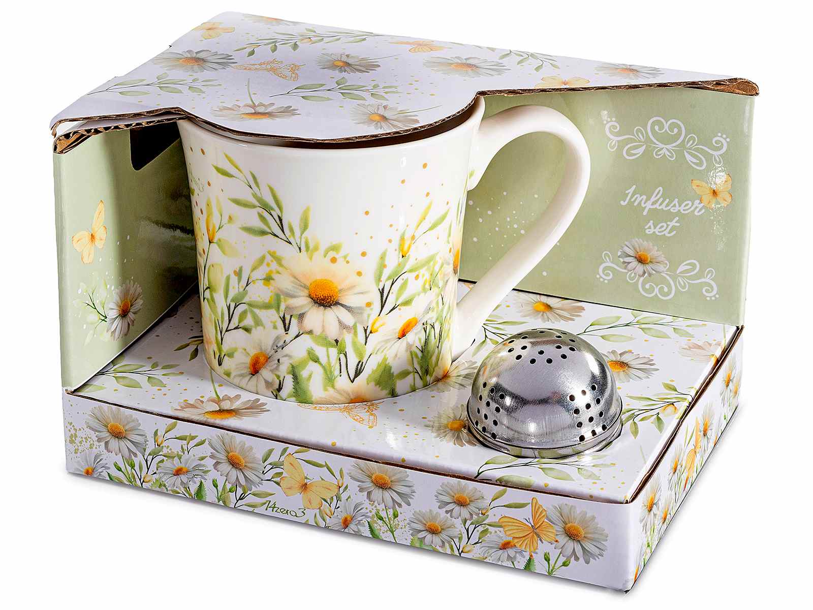 Juego de tazas de porcelana con decoraciones de manzanilla y filtro de metal, en caja de regalo.