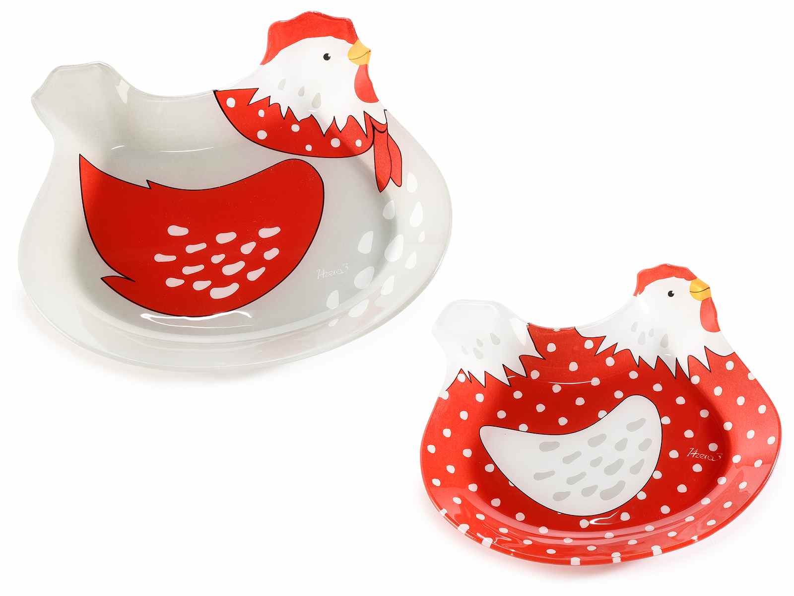 Platos de comida de vidrio con forma de pollo en un juego de 2