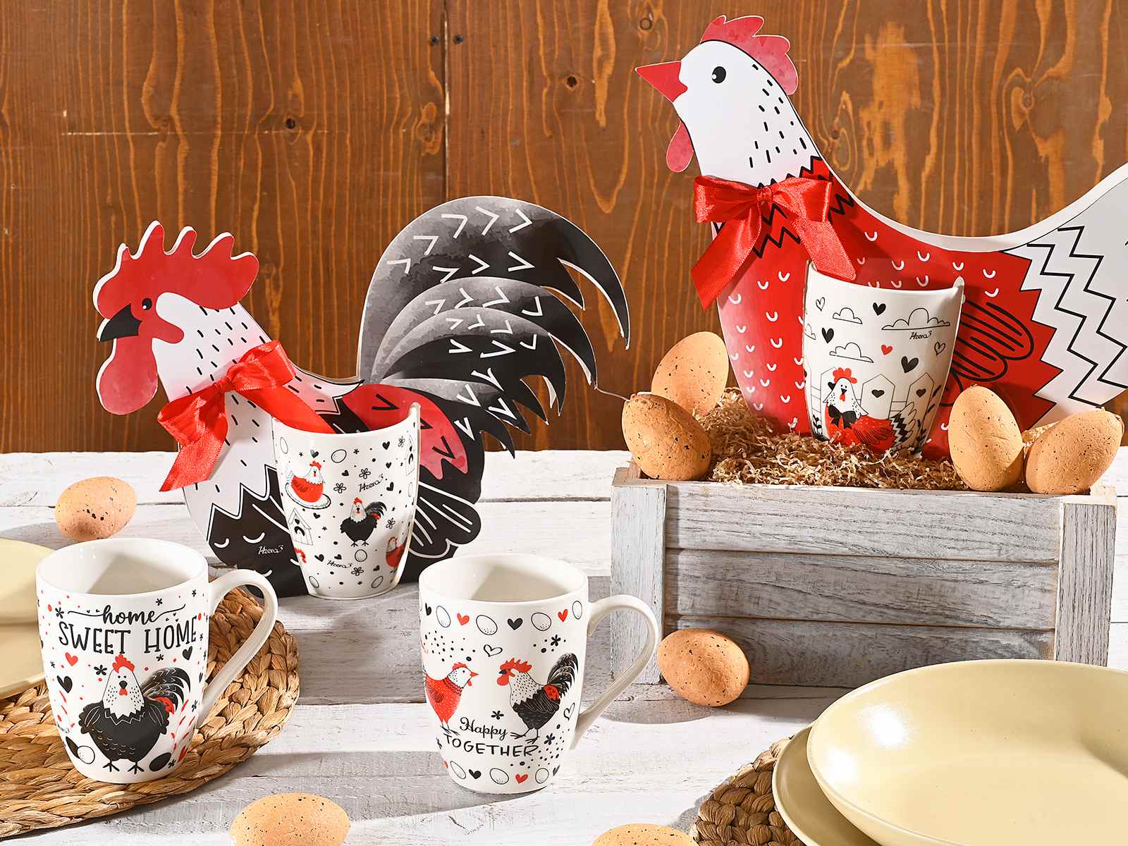 Tazas de porcelana con estampado de pollo y la inscripción "Home Sweet Home" en una caja de regalo con forma de gallina.