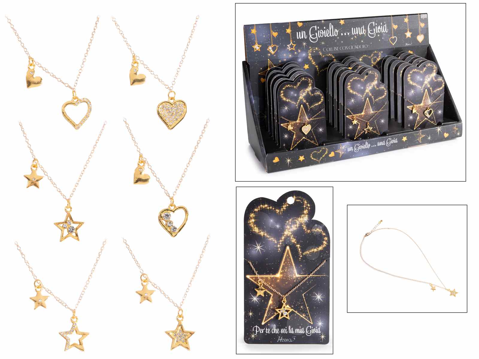 Collares de metal color dorado con 2 colgantes de corazón/estrella con pedrería, en caja/tarjeta de regalo temática con escritura y en expositor de 24 piezas.