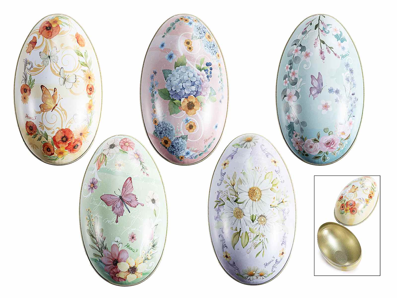 Huevos de Pascua que se pueden abrir fabricados en metal apto para uso alimentario con decoraciones florales, ideales para envolver regalos con temática de Pascua y presentar productos artesanales.