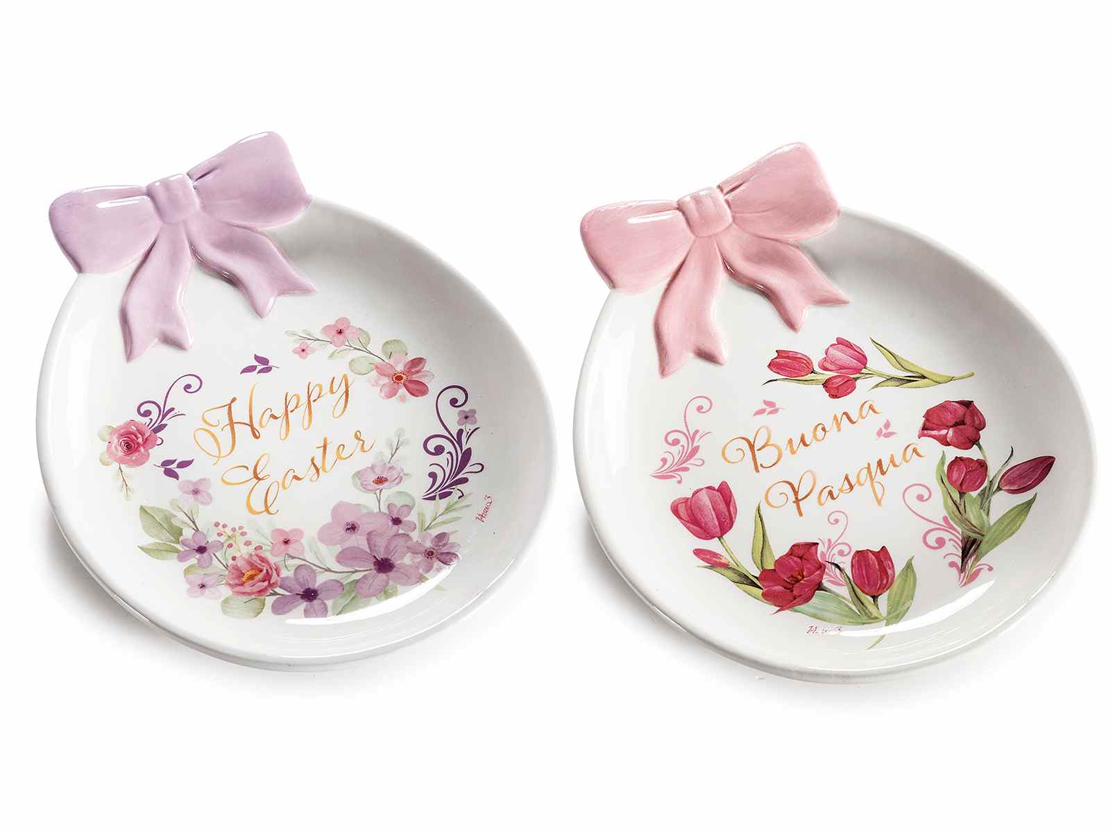 Platos de cerámica aptos para uso alimentario, estilo Pascua, con forma de huevo, lazo en relieve, estampados florales y mensaje de felicitación.