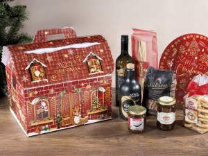Cajas de cartón con forma de casa navideña y asa, decoradas con estampado navideño. Ideal para envolver regalos, cestas navideñas y embalajes festivos. Perfecto para tiendas, dulces navideños y como idea de embalaje para pandoro/panettone.
