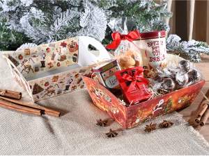 Bandejas medianas de papel navideñas con decoraciones temáticas. Ideal para embalar cestas de regalo y productos alimenticios. Equipado con asas para un transporte práctico y seguro.